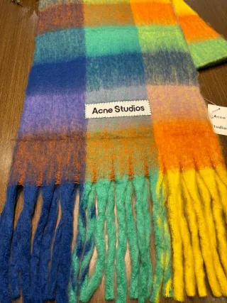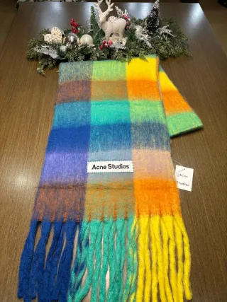 Cachecol Acne Studios com um design xadrez vibrante e moderno. - Dimensões: 240x40 cm. - Trama macia e felpuda. - Franjas nas extremidades.