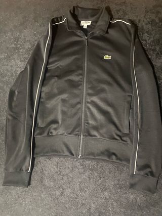 Casaco desportivo Lacoste em preto. - Fecho completo frontal. - Gola subida. - Bolsos laterais. - Punhos e bainha canelados. - Detalhes de riscas brancas nas mangas.