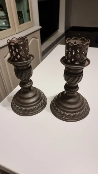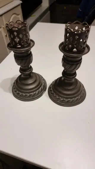 Par de castiçais em estanho, com um design clássico e elegante. - Material: 99% estanho - Design detalhado com acabamento envelhecido