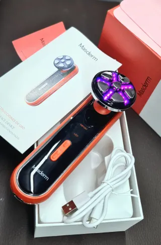 O dispositivo na imagem é o aparelho de radiofrequência facial Masderm RF Face Device. É um dispositivo de uso doméstico que utiliza tecnologia de radiofrequência e terapia LED para tratamentos faciais. Tecnologia: Combina radiofrequência (RF) e terapia de luz LED. Funções: Ajuda a combater a flacidez da pele, reduzir rugas finas e melhorar a luminosidade da tez. Aplicação: Concebido para tratamentos de lifting facial em casa, com resultados profissionais. Uso: Deve ser usado como complemento de uma rotina cosmética e permite sessões semanais para melhores resultados.