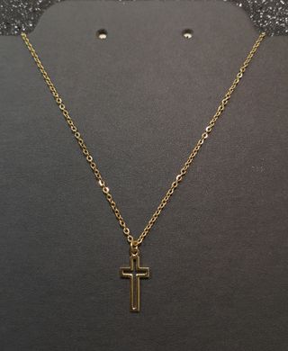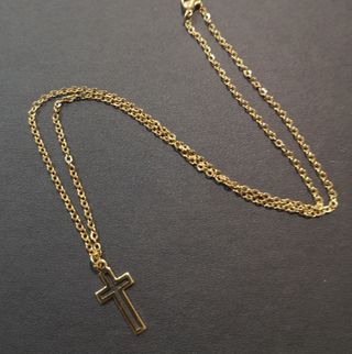 Fio e cruz em aço inoxidável dourado, em saco de organza, comprimento do fio 50cm. Pode ser entregue em mão em Alcochete.