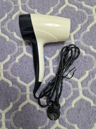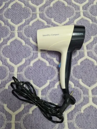 Secador de cabelo compacto da Philips, ideal para viagens. Possui um design moderno e é fácil de manusear. - Modelo SalonDry Compact - Cor preta e branca - Cabo de alimentação preto