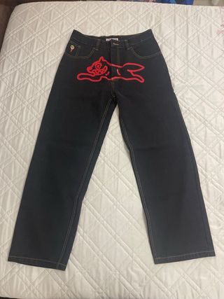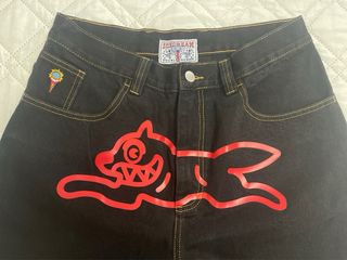 Calça jeans preta da marca BBC Ice Cream com estampa gráfica. - Estampa gráfica vermelha. - Costura amarela aparente.