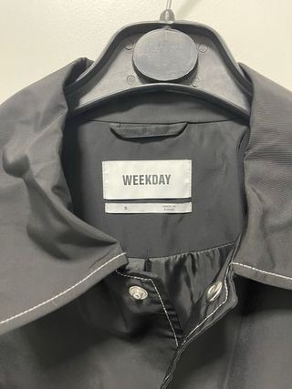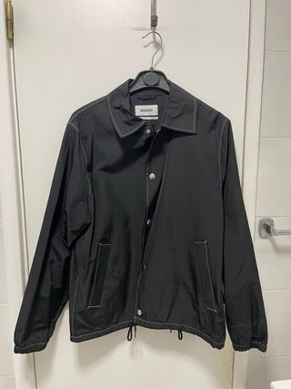 Casaco estilo coach jacket da marca Weekday. - Cor preta com costura branca contrastante. - Fecho de botões. - Bolsos frontais. - Cordão ajustável na barra.