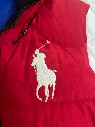 Colete acolchoado da Polo Ralph Lauren em vermelho vibrante, com forro azul contrastante e detalhes em preto. - Logo icónico Pony bordado em branco no peito. - Capuz integrado ajustável e removível. - Fecho de correr frontal. - Bolsos laterais com fecho de correr. - Cordões ajustáveis na bainha e dentro dos bolsos