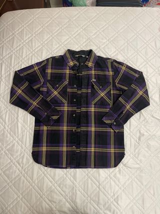 Camisa de manga comprida com padrão xadrez vintage - Padrão xadrez em preto, roxo e amarelo. - Dois bolsos no peito com botões. - Fecho de botões na frente.