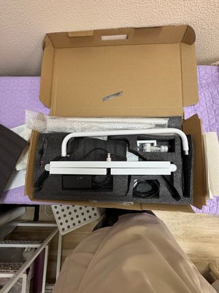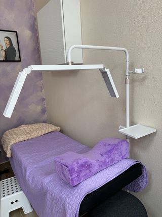 Candeeiro de estética com design moderno e ajustável. - Braço articulado para posicionamento flexível. - Base estável. - Bandeja de apoio integrada.