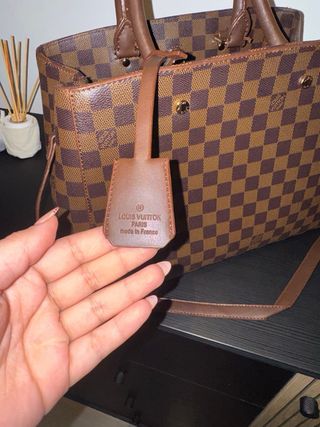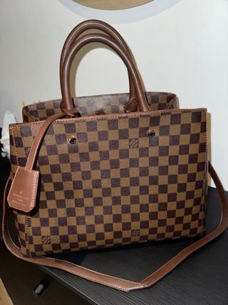 Mala de senhora em castanho. - Padrão xadrez icónico. - Alças de mão em pele. - Alça de ombro removível. - Etiqueta de identificação em pele.