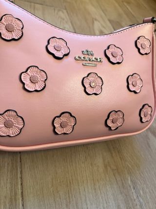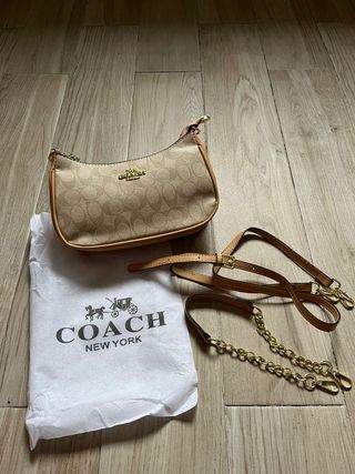 Mala pequena da Coach em padrão característico da marca. - Cor castanha com detalhes dourados. - Alça de mão e alça de ombro removível. - Inclui etiqueta da marca.