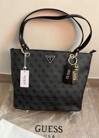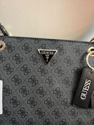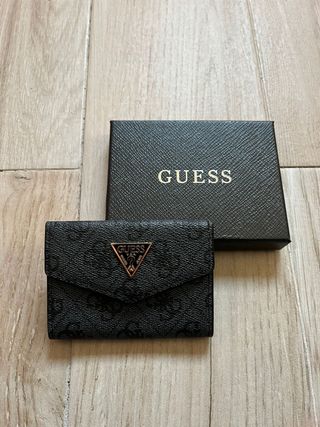 Carteira da marca Guess, com um design elegante e moderno. - Padrão monograma. - Detalhe de triângulo com logo. - Fecho em aba.