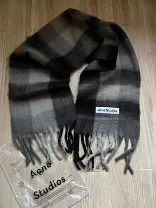 Lenço Acne Studios com padrão xadrez em tons de cinza e preto. Possui franjas nas extremidades. - Material macio e quente. - Design clássico e versátil.