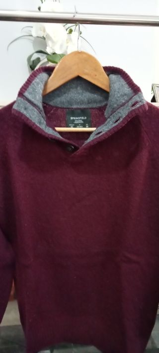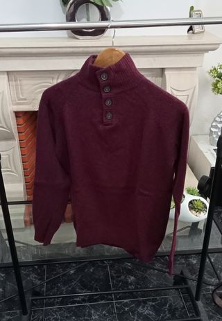 Camisola de malha em tom bordeaux, com um design elegante e confortável. Camisola Usada da marca Springfiel em Bom Estado de cor Bordeaux com Botões, tamanho S2 (Grande), com 70% Lã e 30% Acrílico. - Gola com botões. - Detalhe de malha canelada na gola.