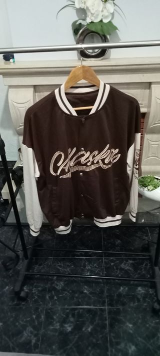 Casaco estilo bomber em tons castanho e bege, com fecho de botões. - Mangas em contraste. - Gola e punhos com riscas. - Detalhe de bordado Alaska no peito.