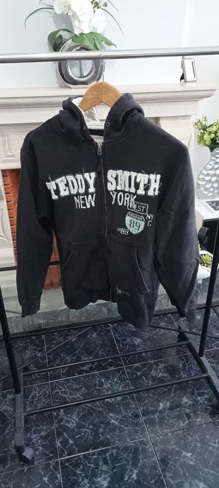 Casaco Usado com capuz da marca Teddy Smith. - Cor preta. - Fecho frontal. - Bolsos frontais.