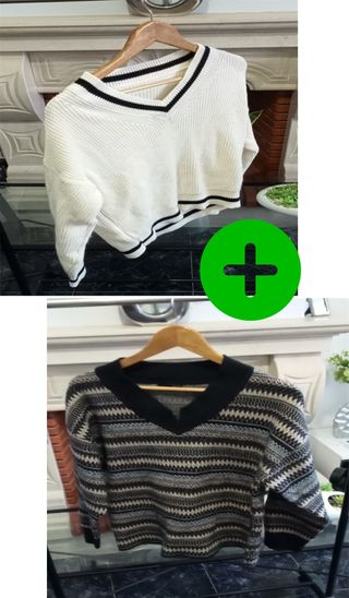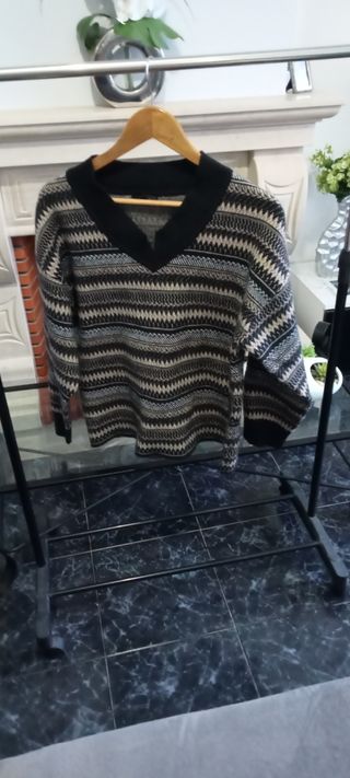 Camisola de malha com decote em V e detalhes listrados. A blusa Dazy apresenta um padrão geométrico. - Camisola branca com riscas pretas. - Blusa com padrão geométrico em tons de preto, branco e castanho.