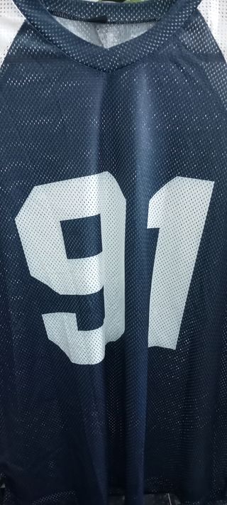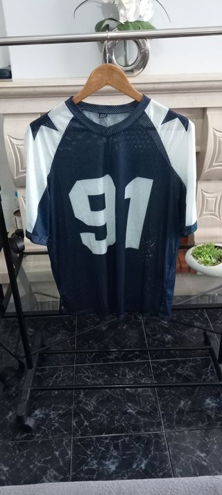 T-shirt desportiva com um design moderno. - Mangas brancas com detalhes. - Corpo da t-shirt em azul escuro com malha perfurada. - Número 91 em branco na frente.
