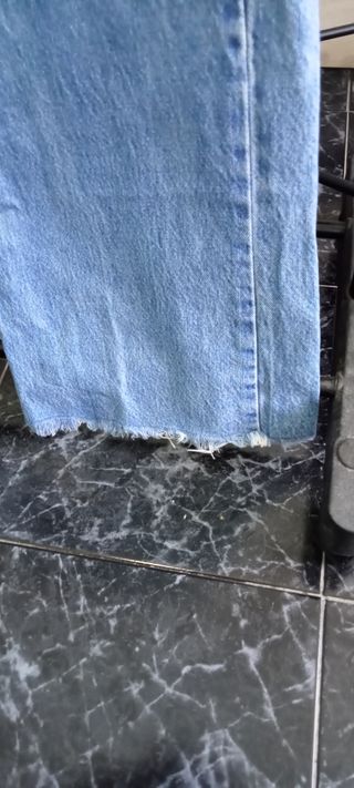 Calças de ganga da Stradivarius em tom azul. Apresentam um acabamento desfiado na bainha. - Tecido de ganga. - Bainha desfiada.