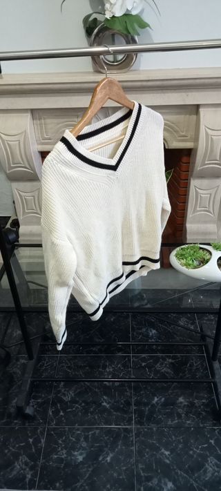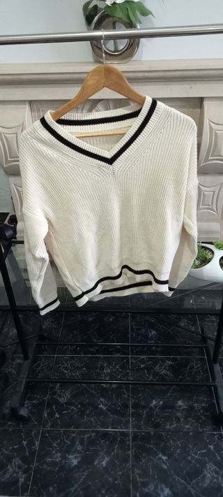 Camisola de malha creme com decote em V e detalhes em preto. - Gola em V com riscas pretas. - Punhos e barra com riscas pretas. - Malha texturizada.