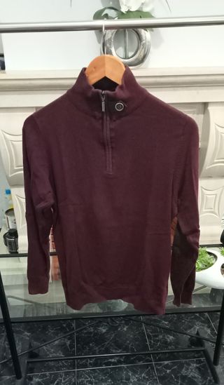 Camisola casual de manga comprida com fecho parcial. - Cor bordeaux. - Gola alta. - Fecho metálico com detalhe. - Tecido em malha.