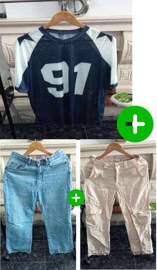 Conjunto T-Shirt + Calças de Ganga + Calças Cremes
