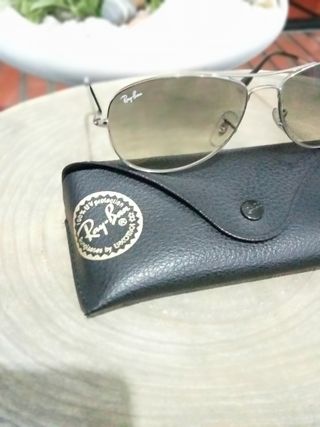 Óculos de Sol Aviator da Ray-Ban em Estado Satisfatório (alguns sinais de desgaste normal (pequenos riscos e pontos), que não afeta a visão devido a isso baixei o preço), com Estojo de Arrumação Original. - Lentes escuras. - Armação em metal prateado. - Inclui capa de couro.