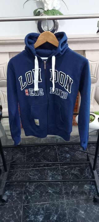 Casaco com Capuz London Project pouco usado de cor Azul e tamanho M mas pequeno mais um S. - Fecho frontal completo. - Capuz ajustável com cordão. - Bolsos frontais. - Detalhe de bandeira do Reino Unido e ENG LAND no peito.
