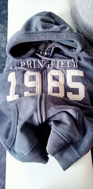 Casaco com capuz da marca Springfield, com um design moderno e confortável. - Fecho frontal. - Capuz ajustável com cordões. - Detalhe 1985 bordado na frente.