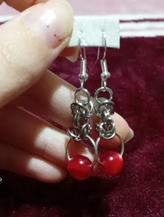 Brincos com um toque alternativo e um design único. - Detalhes em malha metálica. - Contas vermelhas redondas. - Fecho de gancho prateado.