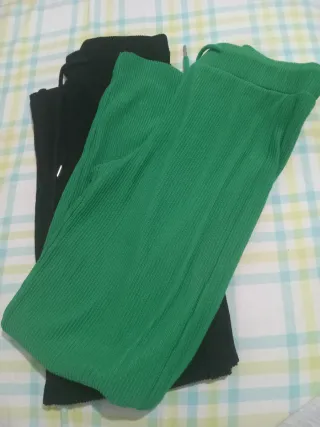 Calças super confortáveis em malha canelada. - Cor preta. - Cor verde. - Cintura com cordão.