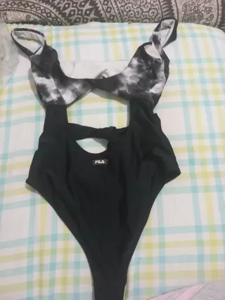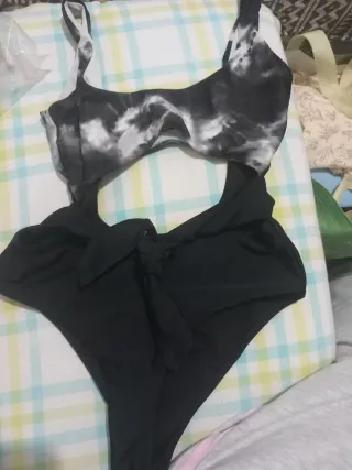 Fato de banho com um design moderno e elegante. - Parte superior com padrão tie-dye. - Parte inferior preta com laço. - Recorte na zona da cintura.