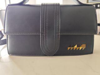 Mala preta com um design sofisticado e detalhes únicos. - Fecho com aba. - Alça de mão. - Detalhe geométrico dourado na lateral.
