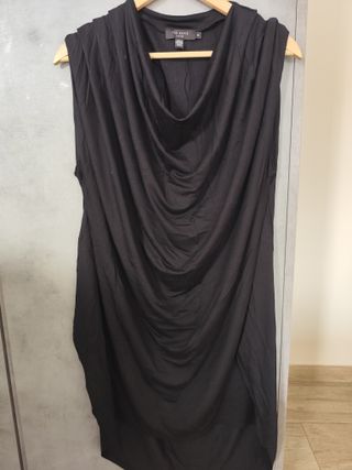 Vestido preto com um corte elegante e drapeado. - Tecido macio e fluido. - Design sem mangas. - Decote em V pronunciado.