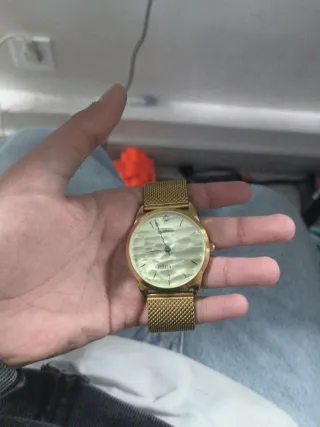 Relógio de pulso com acabamento dourado. - Design elegante e moderno. - Bracelete em malha metálica. - Mostrador com detalhes. - Fecho ajustável.