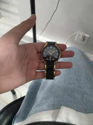 Relógio com um design elegante e moderno. - Caixa e bracelete em tons dourados e pretos. - Mostrador escuro com detalhes dourados.