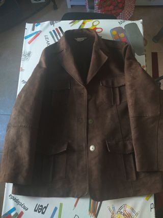 Casaco de senhora em camurça sintética. - Cor castanha. - Fecho com botões. - Bolsos frontais com lapela.