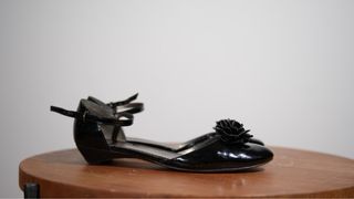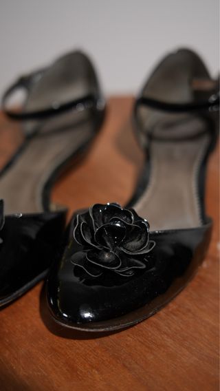 Sabrinas pretas com um detalhe de flor. - Material: Verniz - Cor: Preto - Detalhe: Flor aplicada na frente