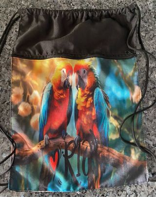 Linda mochila de pano com estampa de araras e o nome 'Rio'. Ideal para carregar pequenos objetos. - Mochila pequena, perfeita para uso diário. - Design moderno e colorido. - Fecho com zíper e cordão para ajuste.