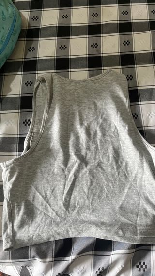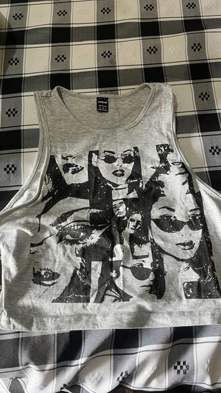 Top cinzento sem mangas com uma estampa gráfica de rostos. - Decote redondo. - Sem mangas Usado poucas vezes.