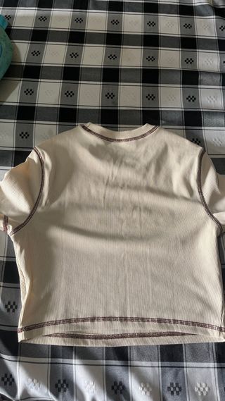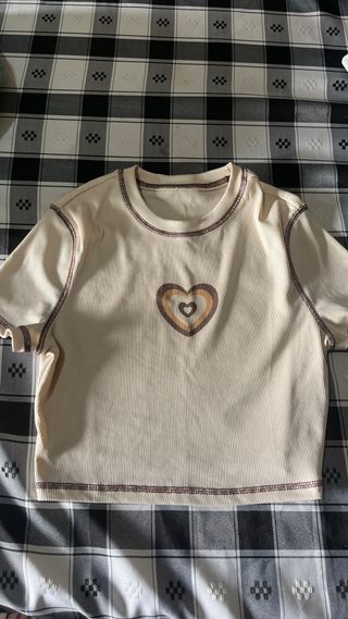 Top curto da Shein com estampa de coração em camadas. - Tecido canelado. - Costura externa em tom marrom. - Manga curta.