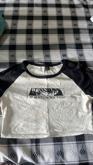 Top com estampa gráfica I'm watching you e mangas contrastantes. - Mangas raglan pretas. - Estampa frontal em preto e branco. - Tecido leve e confortável.