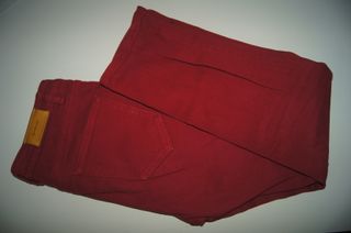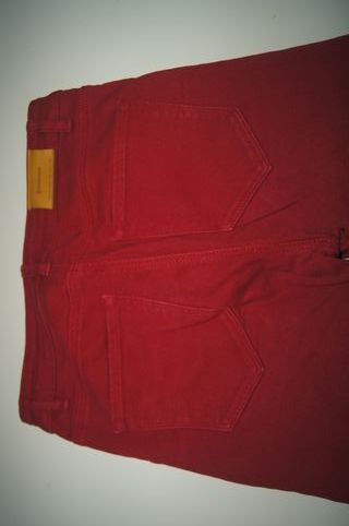 Calças de ganga da Stradivarius em tom vermelho vibrante. Perfeitas para um look casual e moderno. - Cintura alta. - Bolsos frontais e traseiros. - Fecho de botões e fecho éclair.