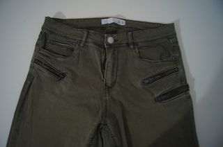 Calças de ganga em tom verde militar, perfeitas para o dia a dia. - Tamanho 38. - Design moderno e confortável.