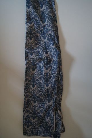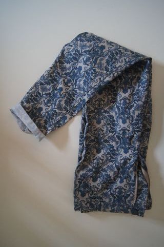 Calças com um padrão floral em tons de azul e bege. - Padrão floral - Dobra na bainha