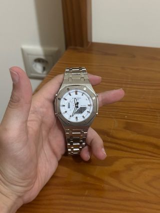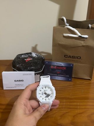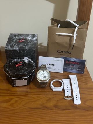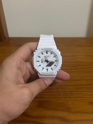 Relógio Casio G-Shock GA2100 com modificação CasiOak. - Caixa e pulseira em metal prateado. - Mostrador branco. - Inclui caixa original e manual. - Acompanha pulseira e moldura brancas adicionais.
