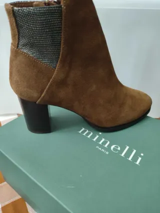 Botas de senhora da marca Minelli, em castanho e tamanho 36. Novas, nunca usadas. Em caixa original. - Material exterior em camurça e pele. - Detalhe em tecido com padrão escamado na lateral. - Salto bloco.
