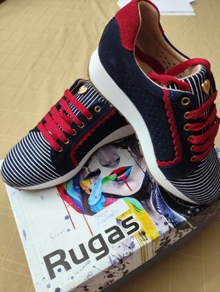 Ténis da marca Rugas, em azul e vermelho, tamanho 36. - Design com riscas. - Detalhes em camurça. - Cadarços vermelhos. - Pequeno detalhe em forma de coração. - Pela Novas em caixa original.