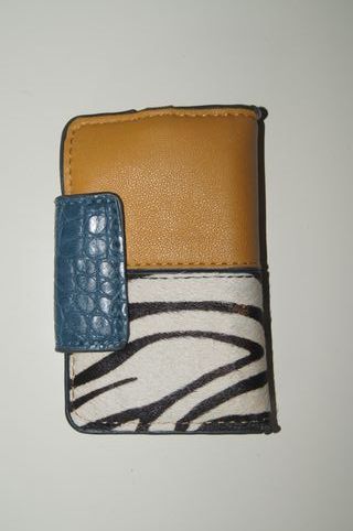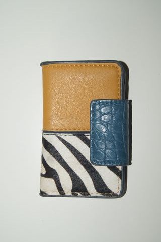 Porta cartões com um design moderno e elegante, combinando diferentes texturas e cores. - Parte frontal com estampa de zebra. - Detalhe em couro caramelo. - Acabamento em couro azul com textura. - Costura aparente em tom dourado.