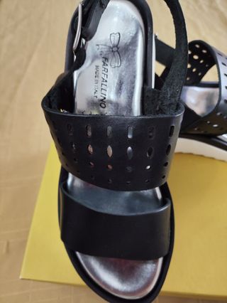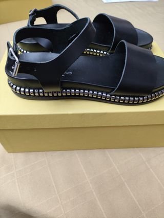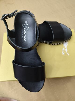 Sandálias elegantes da marca Farfallino. - Design moderno com tiras. - Detalhe de tachas na sola. - Fecho com fivela ajustável. - Pele