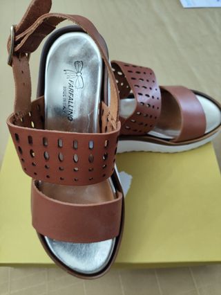 Sandálias elegantes da marca Farfallino, em pele castanha. - Design com perfurações. - Fecho ajustável com fivela. - Sola confortável. - Pele - na caixa