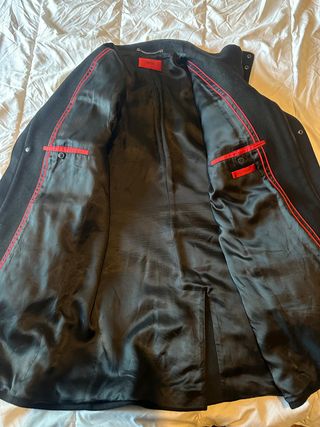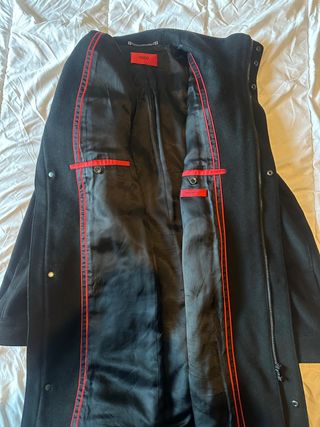 Casaco elegante da Hugo Boss. - Revestimento interior em cetim com padrão HUGO. - Detalhes em vermelho vivo nas costuras e bolsos. - Dois bolsos interiores com fecho de botão. - Etiqueta wool & cashmere no bolso interior.